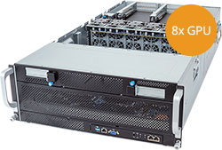 Supports up to 8x double slot GPU cards, 2x 10Gb/s BASE-T LAN ports, redundant power option, 8x 2.5" hot-swappable HDD/SSD bays