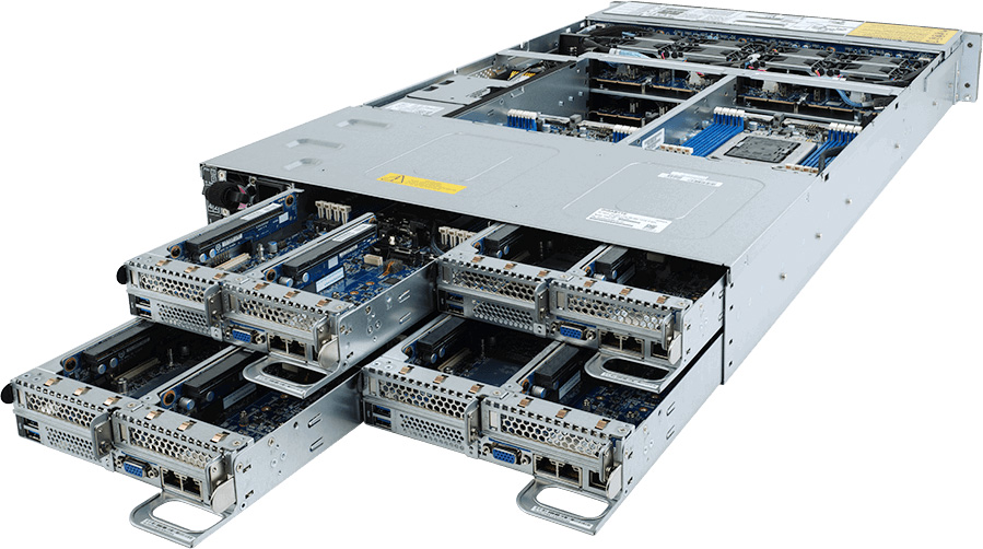 2U - 4 nodes rear access server system, 8x Low profile PCIe Gen4 x16 expansion slots, 8x 1Gb/s LAN ports, 4x dedicated management ports