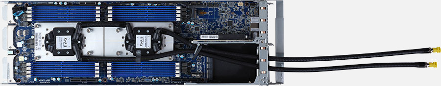 Quad Node, Direct Liquid cooling solution, Dual AMD EPYC 7003 Series Processor, Redundant 2200W Power Supply, 24x 2.5" NVMe/SATA hot-swappable drive bays (6x Per node).