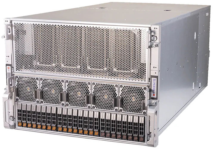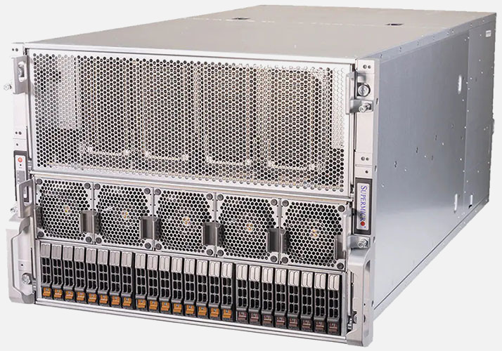Supports 8x HGX H100 GPUs, Dual AMD EPYC 9004 Series 8x GPU Server - 16x 2.5" NVMe + 8x SATA Drives Hot-Swappable bays. Built for AI Training and Inferencing.