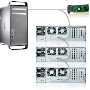 The kit consists of a Apple Macintosh compliant JBOD and a Apple Mac raid card supporting up to 128 devices so with a 45 bay JBOD supporting 4TB HDDs (180 TB) we can add an additional 2 complete JBODs to the one AppleMac raid controller giving an storage capacity of half a pedabyte of Apple Mac storage per AppleMac storage raid controller.