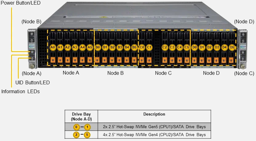 Ideal for Hyperconverged Infrastructure, Diskless HPC Cluster, High-Performance File System and Diskless HPC Clusters. Quad Node 2U Form Factor. Redundant 3000W Power Supply, 6x 2.5" hot-swap NVMe/SATA drive bays (Per Node)