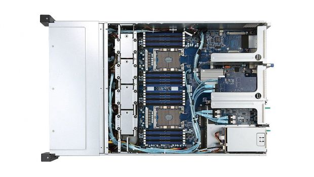 The server presents a pleasingly tidy interior with all 12 dual-ported PCIe NMVe interface cables neatly bundled up and tucked out of the way. Gigabyte's uniform backplane design is quite clever: it has three slots at its base that accept any of Gigabyte's expander boards.