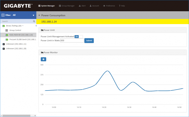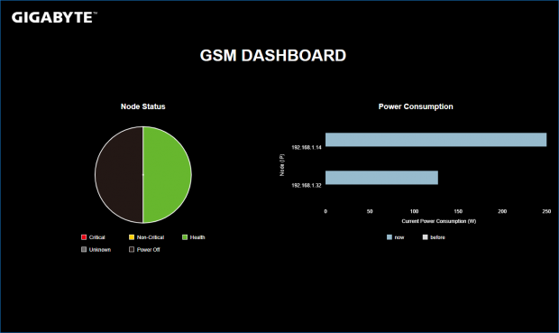 No OS deployment tools are available but Gigabyte does offer its free Server Management utility which can monitor and control multiple systems from one web console. Installed on a Windows Server 2016 host, it automatically discovered the CyberStore's management controller and presented a home page showing a simple pie chart of system availability plus a power consumption bar graph alongside.