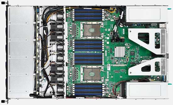 This server supports SATA drives, which are very cost-effective and adept at dealing with mass storage.