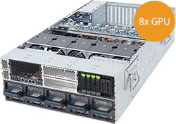 Dual Intel Xeon 6 Series processors, Supports 8x Dual slot Gen5 GPUs, dual 10Gb/s LAN ports, redundant power supply, 8x 2.5" NVMe hot-swappable bays.