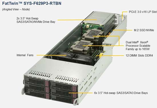 The Supermicro SuperServer F629P3-RTBN | SYS-F629P3-RTBN supports the Intel Intel Xeon Scalable Processors 2nd Generation family in a high-density 4U form-factor. These SuperServers are ideal for network infrastructure, front-end enterprise, and minimal-downtime cluster server systems.
