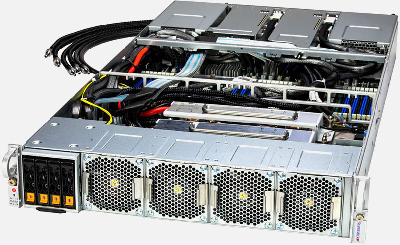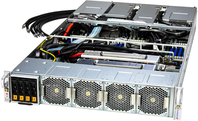 Ideal for High Performance Computing and AI/Deep Learning Training. 3x PCI-E 5.0 x16 LP slots. Redundant 5250W Power Supply, 4x 2.5" NVMe hot-swap drive slots.
