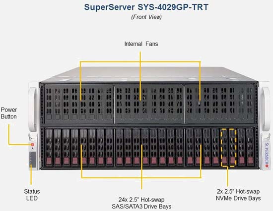 The Supermicro SuperServer 4029GP-TRT | SYS-4029GP-TRT can be configured with 2.5" drives, a more space efficient and low noise option. These drives also offer energy savings and increased flexibility.