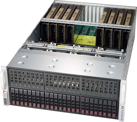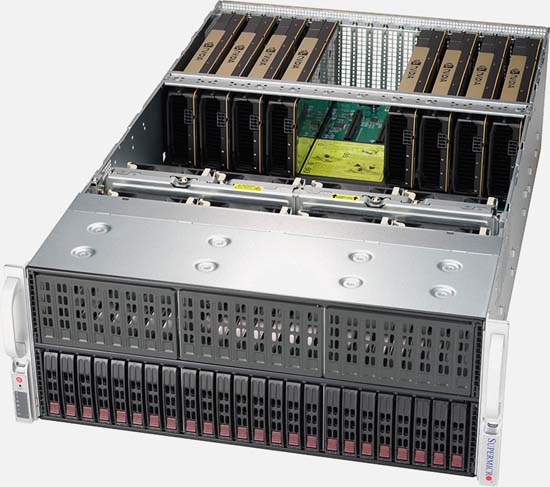 8x PCI-E 3.0 x16 slots (support up to 8x double width GPU), 2x PCI-E 3.0 x8, 1x PCI-E 2.0 x4, Up to 24 Hot-swap 2.5" drive bays; 8x 2.5" drives supported natively, 2x 10GBase-T LAN ports via Intel C622