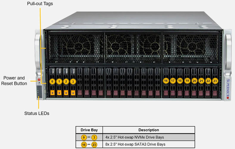 The Supermicro GPU SuperServer 421GE-TNRT3 | SYS-421GE-TNRT3 features hot-swap hard drives, giving you more flexibility and allowing you to remove drives without having to shut down the system.