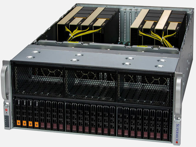Ideal for HPC, AI, Deep Learning, cloud gaming, VDI, rendering and animation. 8x PCI-E 5.0 x16 slots. Redundant 2700W Titanium Power Supply, 24x 2.5" hot-swap NVMe/SATA drive bays