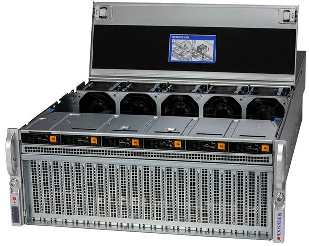 Ideal for High Performance Computing, AI and Deep Learning. 8x PCI-E 5.0 x16 slots. Redundant 3000W Titanium Power Supply, 6x 2.5" hot-swap NVMe/SATA drive bays