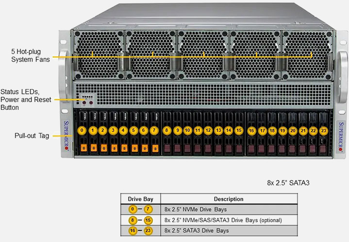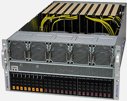 Ideal for HPC, AI, Deep Learning, cloud gaming, VDI, rendering and animation. 13x PCI-E 5.0 x16 slots. Redundant 2700W Titanium Power Supply, 24x 2.5" hot-swap NVMe/SATA drive bays