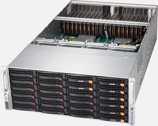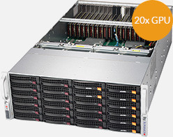 20x PCI-E 3.0 x16 supporting up to 20x Single Width GPU; 1x PCI-E 3.0 x8 (FH, FL in x16 slot), 24x Hot-swap 3.5" drive bays (2x Optional U.2 NVMe 2.5" drives), 2x 10GBase-T LAN ports via Intel C622