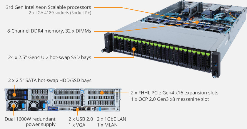 3rd Gen. Intel® Xeon® Scalable DP Server System - 2U 24-Bay Gen4 NVMe, Dual 1Gb/s LAN, Redundant Power Supply. Ideal for Networking.