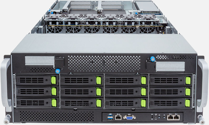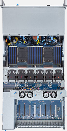 Dual 4th Gen Intel Xeon Scalable Processors, Supports up to 8x double slot GPU cards and 4x PCIe Gen5 x16 (FHFL) Slots, 2x 10Gb/s BASE-T LAN ports (Intel® X710-AT2), 12x 3.5"/2.5" SATA/SAS/NVMe hot-swappable drive bays.