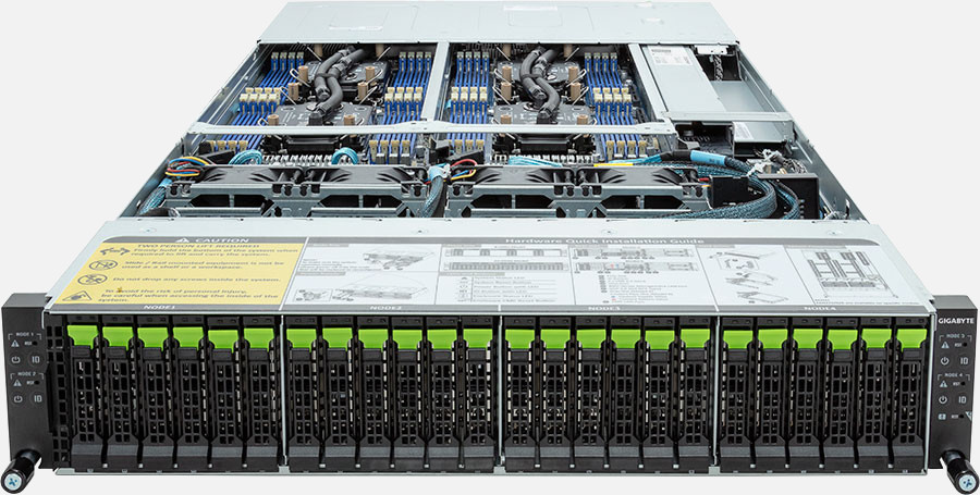 Water Cooling, Quad Node, Dual 4th Gen Intel Xeon Scalable Processors (Per Node), 4x LP PCIe Gen5 x16 slots, 2600W Redundant Power Suppply, 24x 2.5" NVMe/SATA/SAS hot-swappable drive bays.