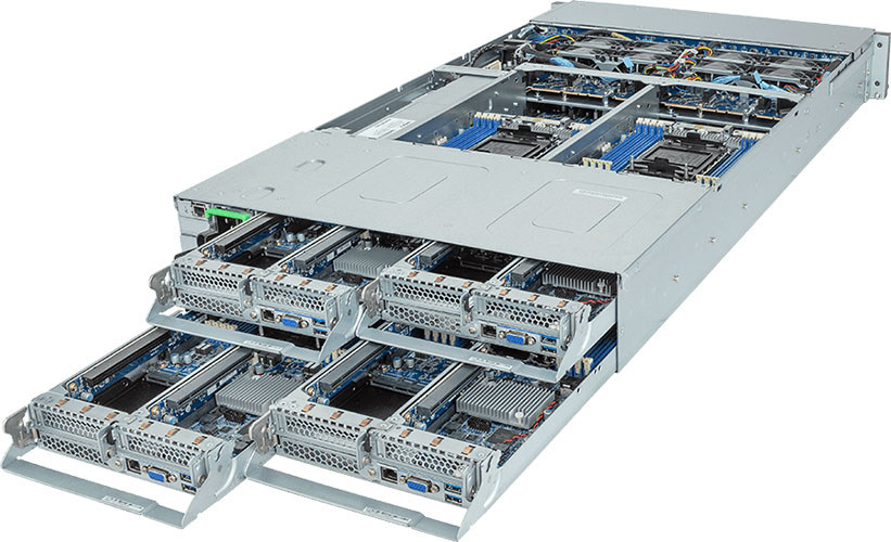 Quad Node, Dual 4th Gen Intel Xeon Scalable Processors (Per Node), 8x LP PCIe Gen5 x16 slots, 3000W Redundant Power Suppply, 8x 2.5" NVMe/SATA/SAS hot-swappable drive bays.