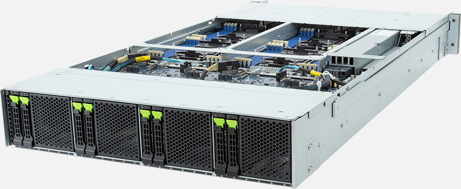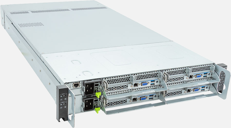 Quad Node, Dual 4th/5th Gen Intel Xeon Scalable Processors (Per Node), 4x LP PCIe Gen5 x16 slots, 3000W Redundant Power Suppply, 8x 2.5" NVMe/SATA/SAS hot-swappable drive bays.