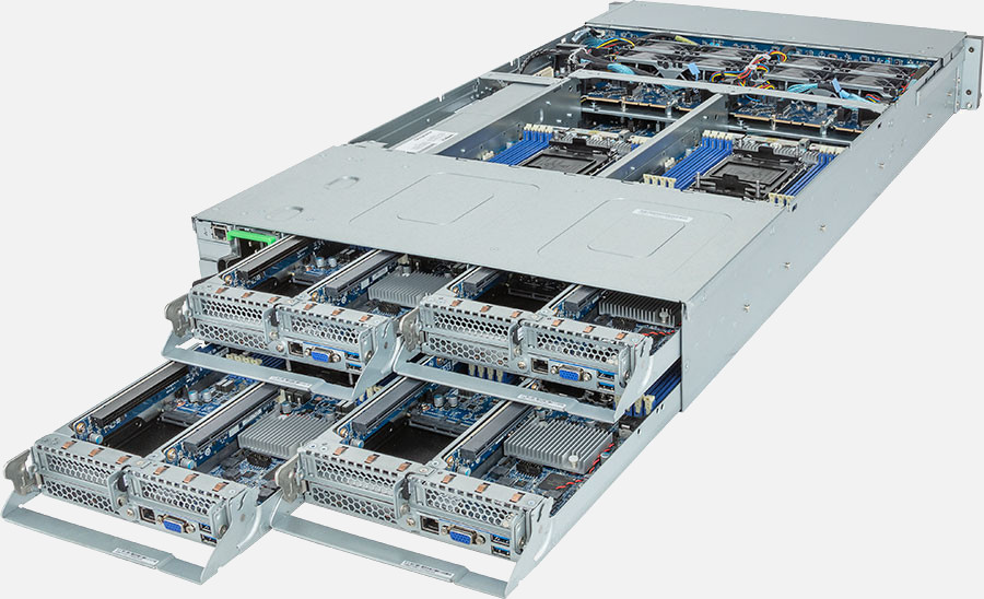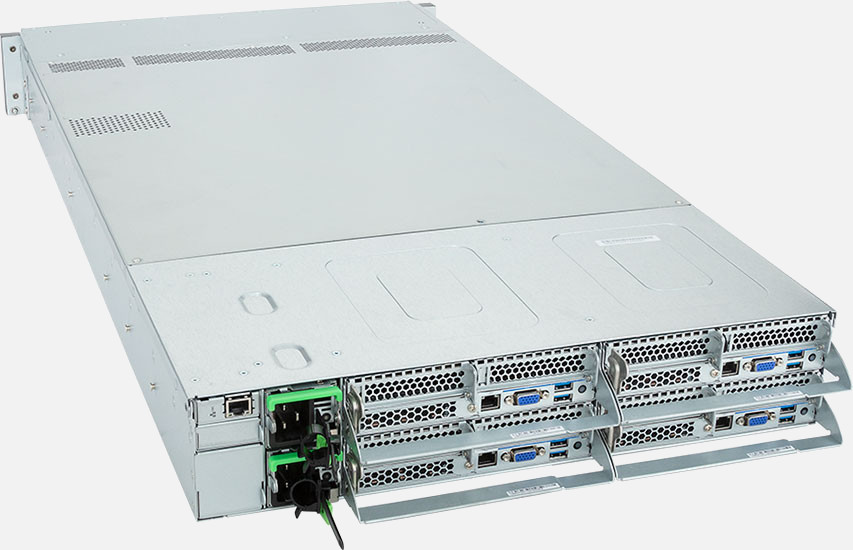 Quad Node, Dual 4th/5th Gen Intel Xeon Scalable Processors (Per Node), 8x LP PCIe Gen5 x16 slots, 3000W Redundant Power Suppply, 24x 2.5" NVMe/SATA/SAS hot-swappable drive bays.