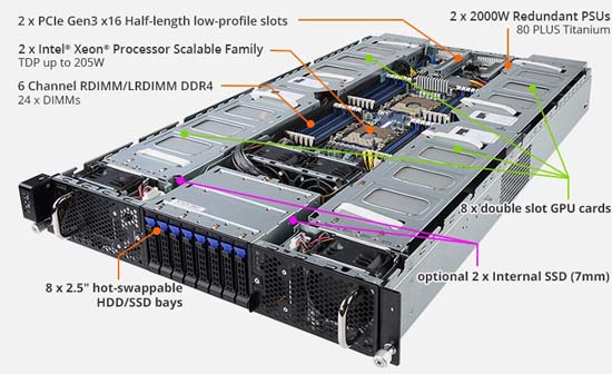 Supports up to 8x double slot GPU cards, 2x 10Gb/s BASE-T LAN ports, 8x 2.5" hot-swappable HDD/SSD bays, redundant power option