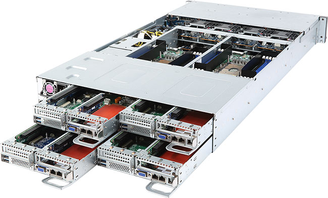 2U - 4 nodes with rear access to the node trays. 8 x 10Gb/s LAN ports. Aspeed® AST2500 remote management controller. Redundant power supply,