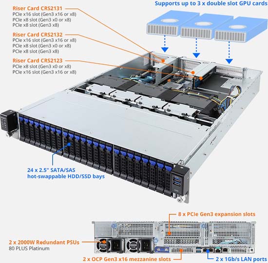 Supports up to 3x double slot GPU cards, 24x 2.5" SATAIII hot-swappable HDD/SSD bays, 8x PCIe Gen3 expansion slots