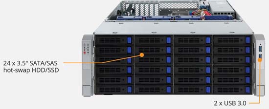 36x 3.5" SATA/SAS hot-swap HDD/SSD bays, 2x 2.5" SATA hot-swap SSD bays for booting device, SAS expander with 12Gb/s transfer speed, 2x 10Gb/s SFP+ and 2x 1Gb/s LAN ports
