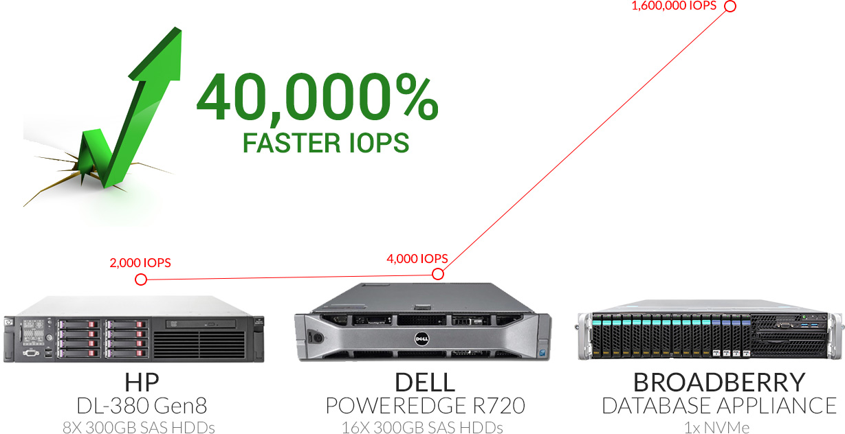 IOPS-hungry applications like Oracle, SQL, and SAP can move business faster, better inform decisions, and improve customer service, but providing the performance they need can be costly. By taking advantage of the latest NVMe technology, the Broadberry SQL appliance can reduce latency by up to 90% and use 84% less rack space, for 80% lower cost/GB than conventional spinning disk solutions.