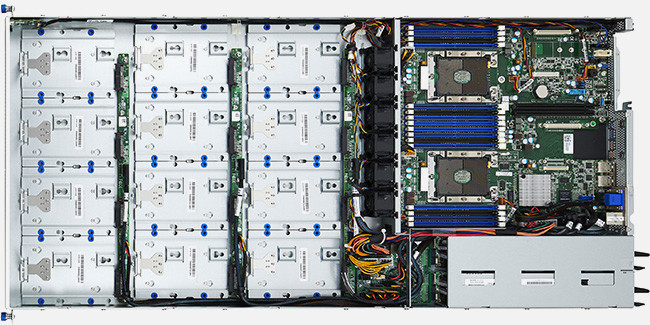 This server solution can be configured with 2.5" drives, which usually provide more energy efficiency, cost efficiency and boosted flexibility.