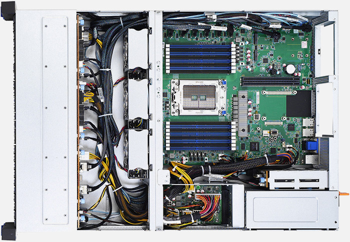 2U1S 4 SATA + 24 NVMe Hybrid Storage Server. 4 FH/FL + 1 HH/HL PCIe Gen.4x8 slots. Single Socket AMD EPYC 7002 processor.