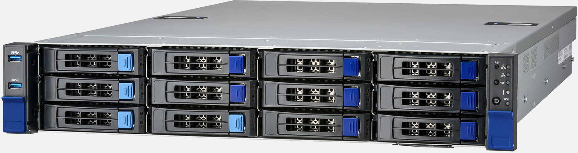 2U1S Storage Server, hybrid NVMe/SAS/SATA BP, 12 SFF. 2x FH/HL PCIe Gen 5.0 x16 slots. 12x SATA/4x NVMe Hybrid hot swap drive bays, 12000W Redundant power supply.