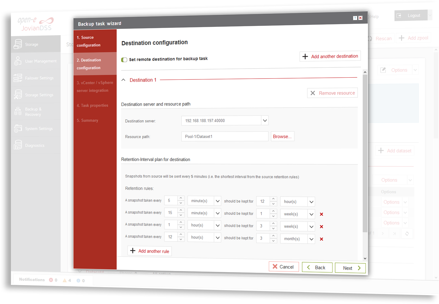 With Open-E JovianDSS on- and off-site data protection, you can create rotational auto-snapshots of NAS or SAN volumes according to instructed set by a retention-interval plan.