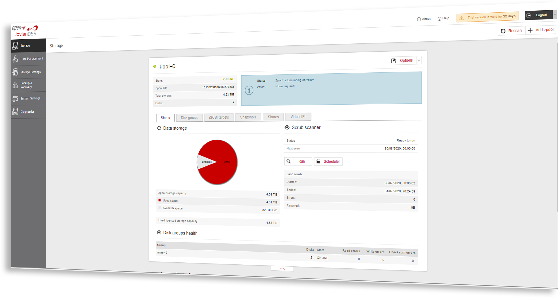 Local backups are kept at your main business location, either on the same server with extra internal drives/external drives or on other Open-E JovianDSS-based servers. This is the most ideal type of backup to protect data in case of ransomware attacks, hardware failure or similar disasters. Data restore is much easier and quicker with local backup than with remote off-site backups. This makes on-site backups the ideal solution for hot data, as its restorable with little downtime.