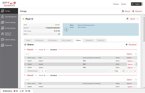 Open-E Jovian DSS allows for the online scaling of your pool and shares. If more capacity is required you can simply attach additional JBODs to your storage controller and add new disks to the existing pool. Open-E JovianDSS allows you to scale up to 10PB of usable space within a single namespace.
