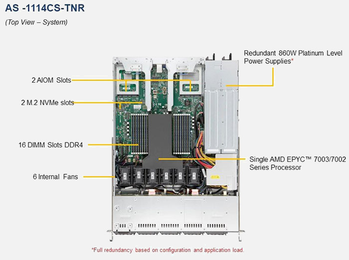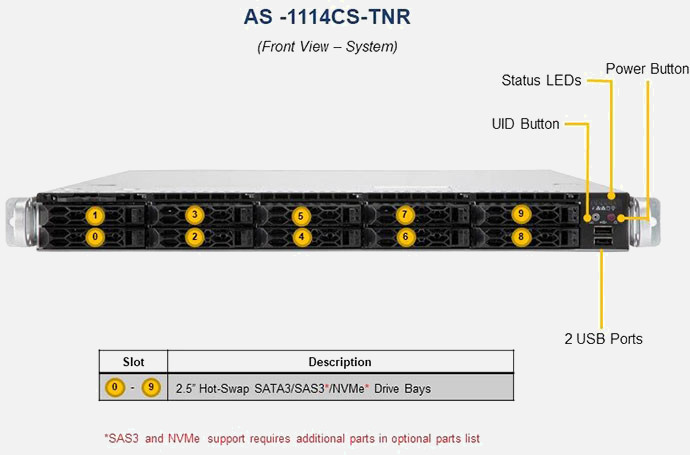 The Supermicro A+ Server 1114CS-TNR | AS-1114CS-TNR can be configured with 2.5" drives, a more space efficient and low noise option. These drives also offer energy savings and increased flexibility.