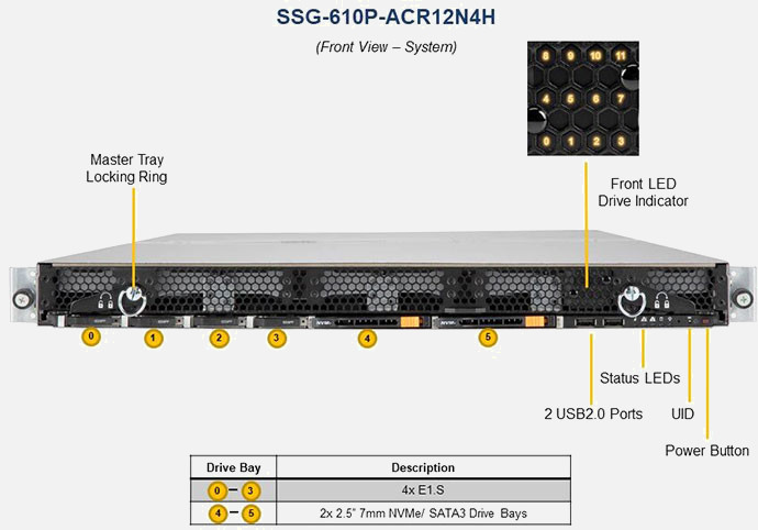 The Supermicro Storage SuperServer SSG-610P-ACR12N4H | SSG-610P-ACR12N4H features hot-swap hard drives, giving you more flexibility and allowing you to remove drives without having to shut down the system.