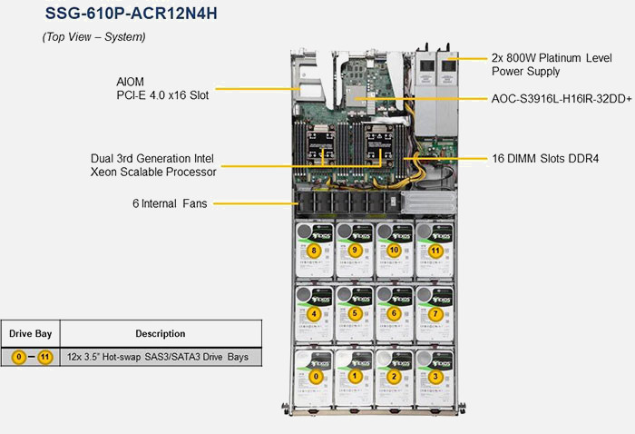 A 1U Supermicro SuperServer based on 2x Intel 3rd Gen Intel Xeon Scalable Processor (X12) range of processors, the Supermicro Storage SuperServer SSG-610P-ACR12N4H | SSG-610P-ACR12N4H is configurable with up to 12x Hot-Swap Drives drive bays, and designed for optimal performance with 16x 3200Mhz DDR4 memory sockets .