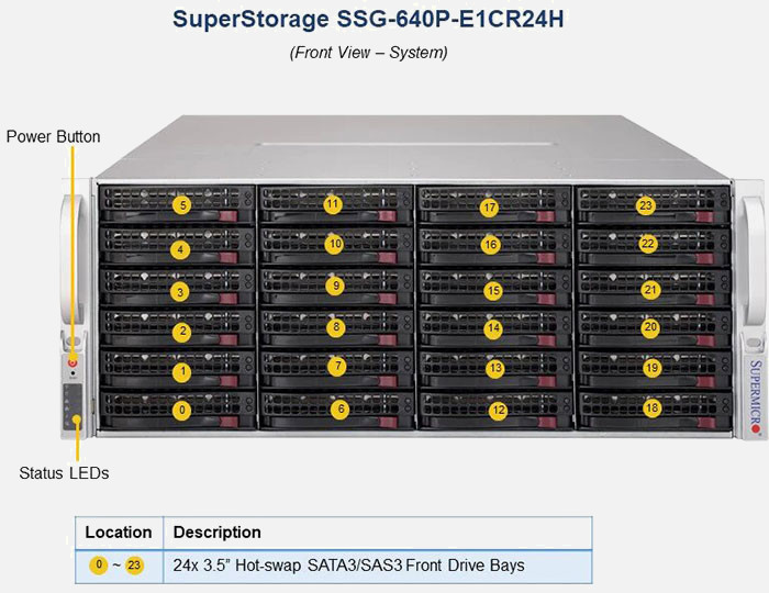 The Supermicro Storage SuperServer SSG-640P-E1CR24H | SSG-640P-E1CR24H features hot-swap hard drives, giving you more flexibility and allowing you to remove drives without having to shut down the system.