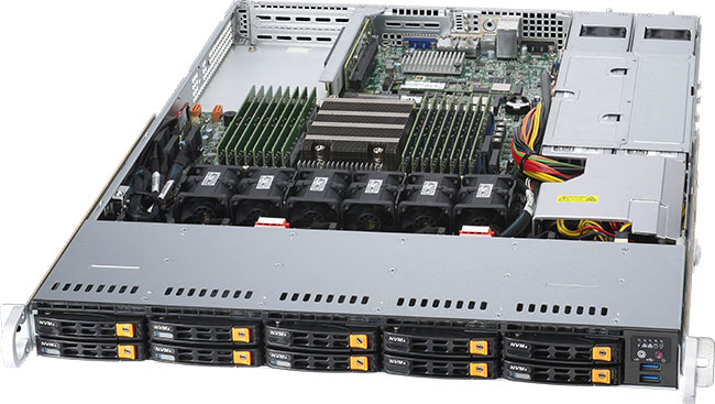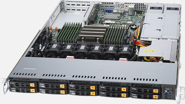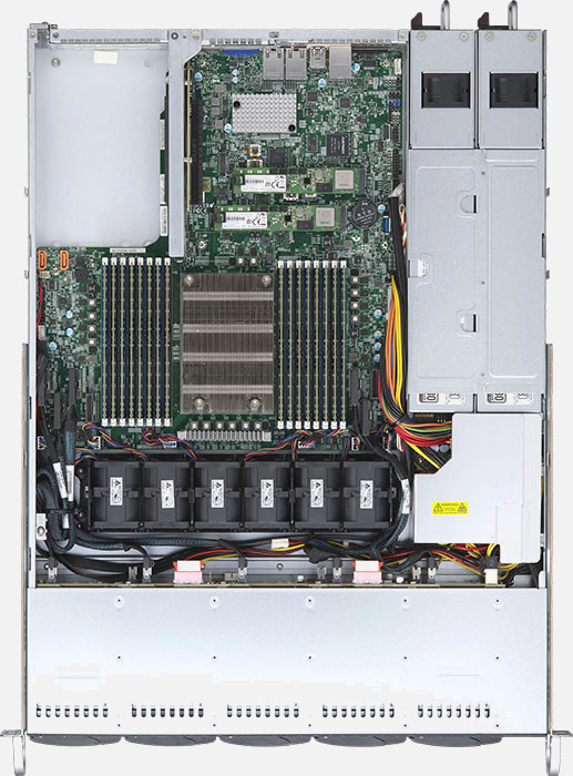 Optimised for virtualisation and cloud computing. Three PCI-E 4.0 x16 slots, dual 10GBase-T LAN. Redundant power supply.