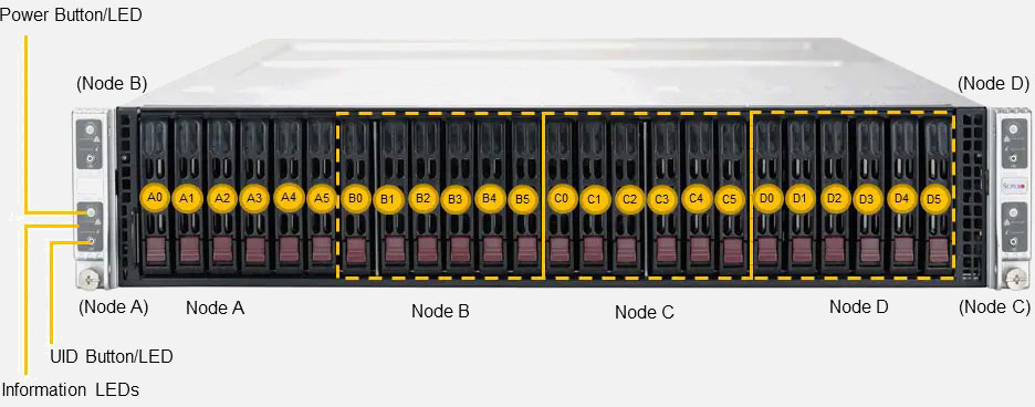 Ideal for Multi-Access Edge Computing, Telecom DRAN, CRAN, and Edge Core Application. Quad Node 2U Form Factor. Redundant 2000W Power Supply, 6x 2.5" hot-swap SATA drive bays (Per Node).