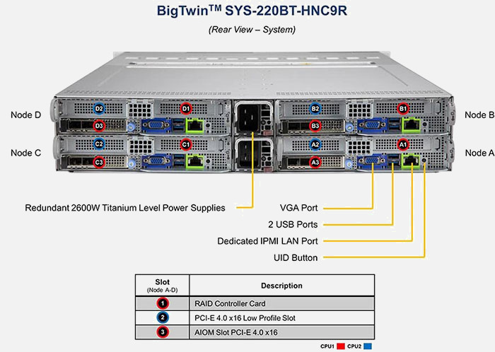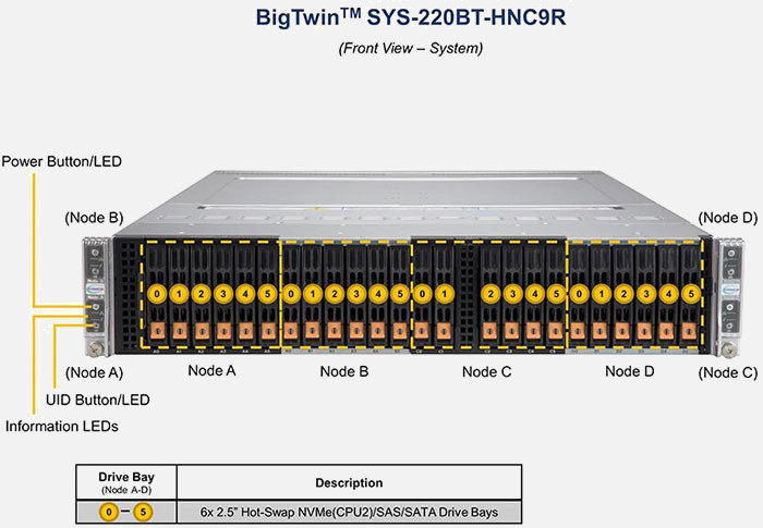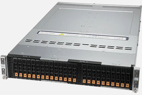 The Supermicro BigTwin SuperServer SYS-220BT-HNC9R | SYS-220BT-HNC9R can be configured with 2.5" drives, a more space efficient and low noise option. These drives also offer energy savings and increased flexibility.