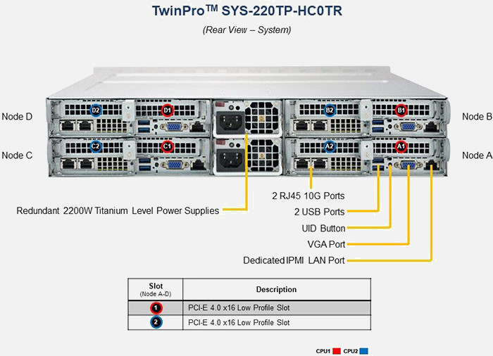 4 node system ideal for big data/big science, hyperconverged infrastructure and HPC. 2x PCI-E 4.0 x16 slots, 1x PCI-E 4.0 x8 slot and 16 DIMMs of memory per node.