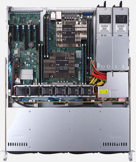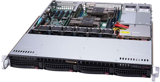 This system can be configured with up to a terabyte of RAM and 4x hot-swap 3.5 SATA drives. It is also equipped with a PCI-E x8 slot and 800W redundant power supplies. For networking it features 2GbE LAN ports via Marvell 88E1512.