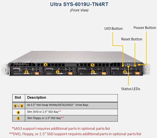 The Supermicro SuperServer 6019U-TN4RT | SYS-6019U-TN4RT supports the Intel Xeon Scalable Processors 2nd Generation family in a high-density 1U form-factor. These SuperServers are ideal for network infrastructure, front-end enterprise, and minimal-downtime cluster server systems.