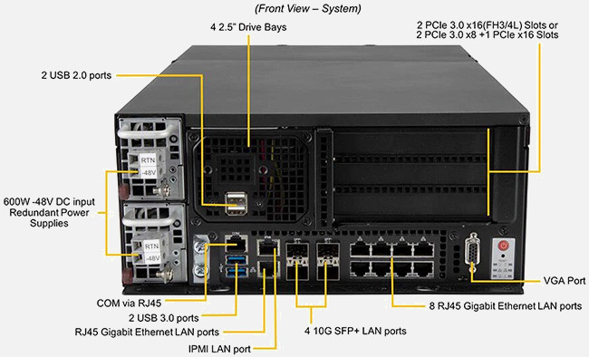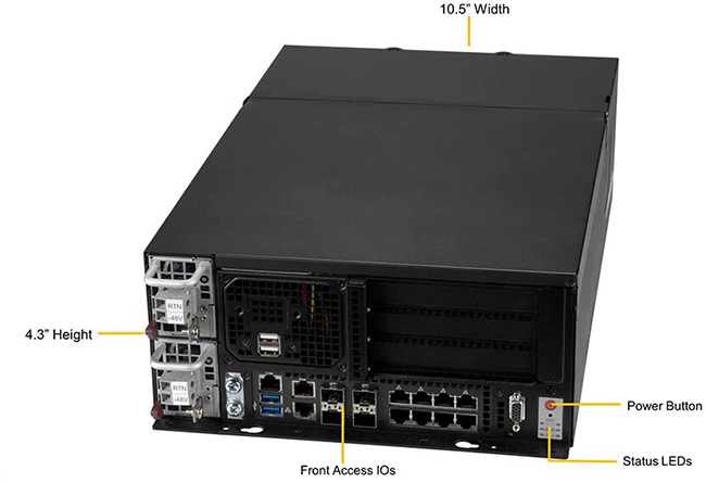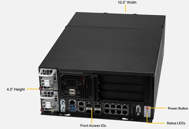 Optimised for Multi-Access Edge Computing (MEC), Network Function Virtualisation (NFV) and Edge Computing. 9 GbE (one for Ethernet management), 4x 10G SFP+, 1 Dedicated IPMI LAN port.