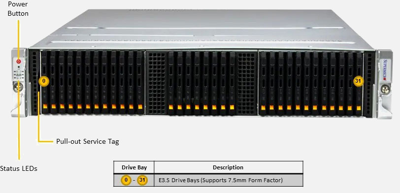 Single AMD EPYC 9004 Series Processor. 2x PCIe 5.0 x16 FH slot, Redundant 2000W power supply. 32x E3.S NVMe hot-swappable drive bays.