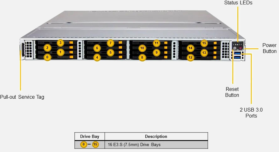 Dual 4th Gen Intel Xeon Scalable Processors, Ideal for Data Intensive HPC, In-Memory Computing, Private & Hybrid Cloud and Software-defined Storage. 2x PCI-E 5.0 x16 slots. Redundant 1600W redundant Power Supply, 16x hot-swap E3.S (7.5mm) NVMe drive bays