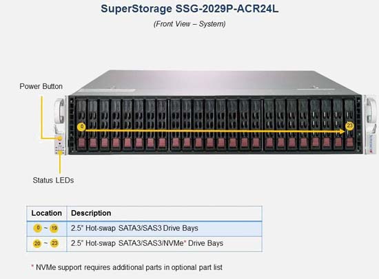 The Supermicro SuperStorage 2029P-ACR24L | SSG-2029P-ACR24L can be configured with 2.5" drives, a more space efficient and low noise option. These drives also offer energy savings and increased flexibility.